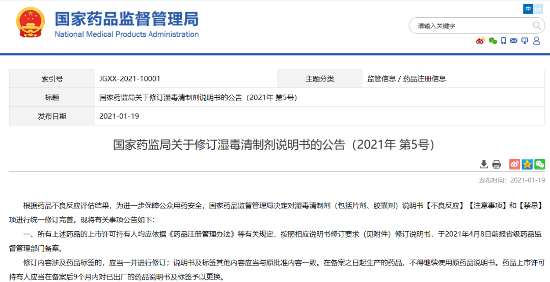 關(guān)于修訂濕毒清制劑說(shuō)明書(shū)的公告(2021年 第5號(hào))