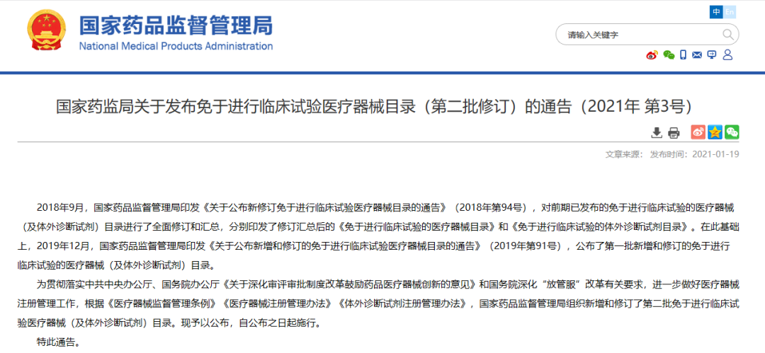 關(guān)于發(fā)布免于進(jìn)行臨床試驗(yàn)醫(yī)療器械目錄(第二批修訂)的通告(2021年 第3號(hào))