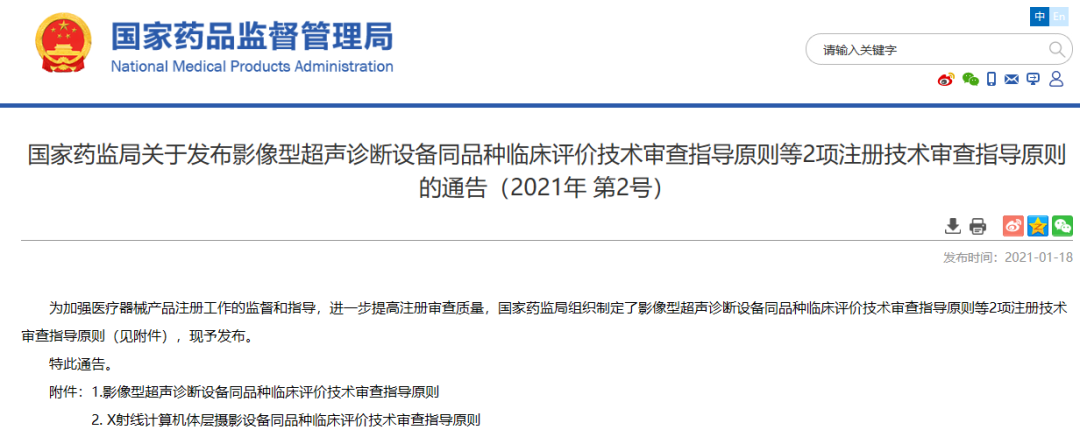 關(guān)于發(fā)布影像型超聲診斷設(shè)備同品種臨床評(píng)價(jià)技術(shù)審查指導(dǎo)原則等2項(xiàng)注冊(cè)技術(shù)審查指導(dǎo)原則的通告(2021年 第2號(hào))