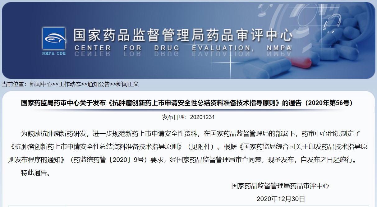 關(guān)于發(fā)布《抗腫瘤創(chuàng)新藥上市申請安全性總結(jié)資料準(zhǔn)備技術(shù)指導(dǎo)原則》的通告(2020年第56號)