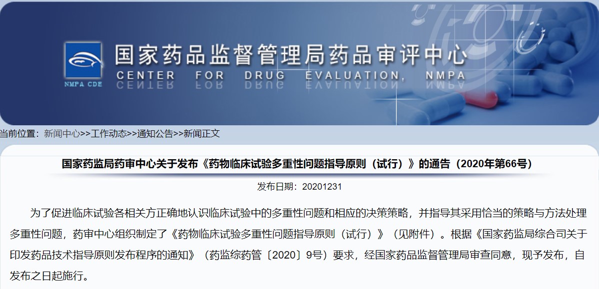 關(guān)于發(fā)布《藥物臨床試驗多重性問題指導(dǎo)原則(試行)》的通告(2020年第66號)