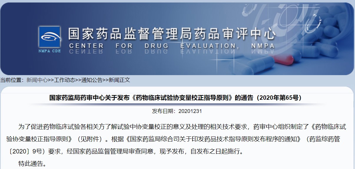 關(guān)于發(fā)布《藥物臨床試驗協(xié)變量校正指導(dǎo)原則》的通告(2020年第65號)