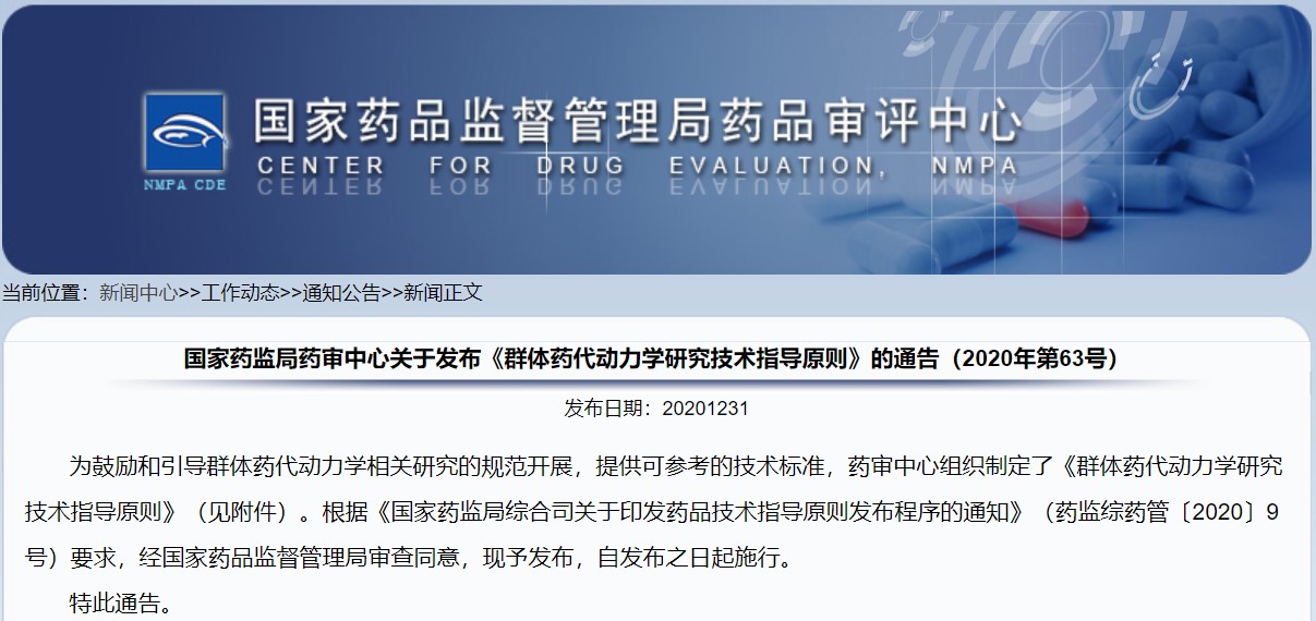 關(guān)于發(fā)布《群體藥代動力學(xué)研究技術(shù)指導(dǎo)原則》的通告(2020年第63號)