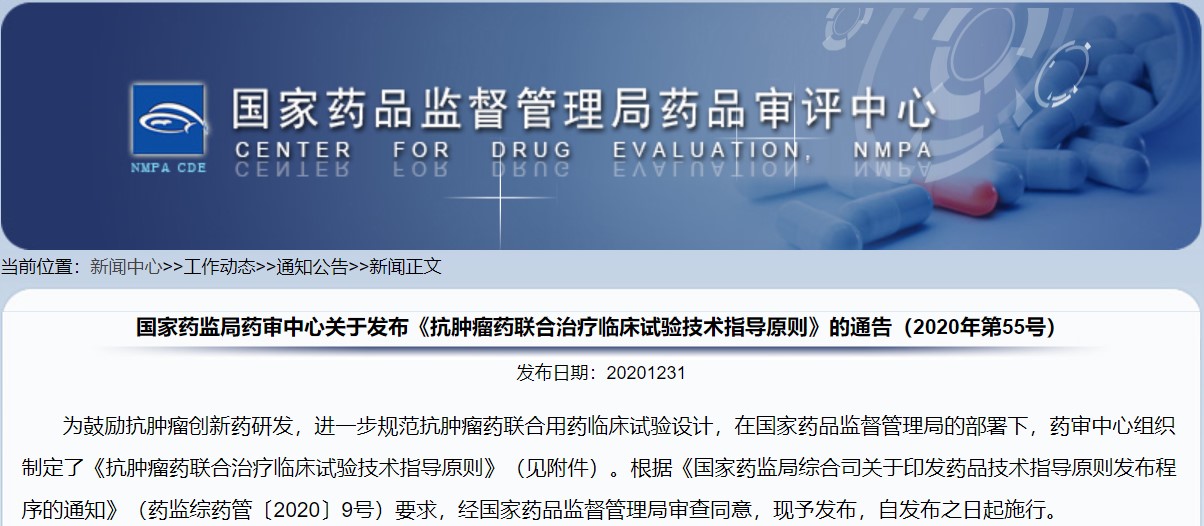 關(guān)于發(fā)布《抗腫瘤藥聯(lián)合治療臨床試驗技術(shù)指導(dǎo)原則》的通告(2020年第55號)