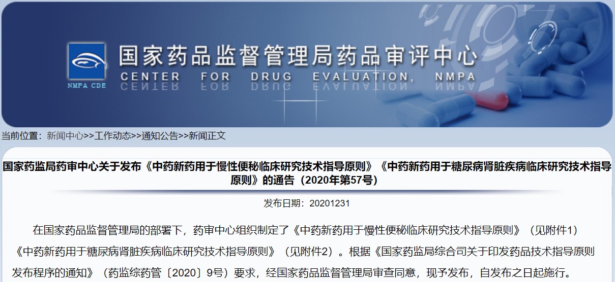 關(guān)于發(fā)布《中藥新藥用于慢性便秘臨床研究技術(shù)指導(dǎo)原則》《中藥新藥用于糖尿病腎臟疾病臨床研究技術(shù)指導(dǎo)原則》的通告(2020年第57號)
