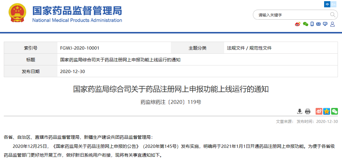 關(guān)于藥品注冊網(wǎng)上申報的公告(2020年 第145號)