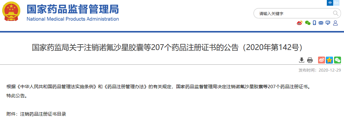 關(guān)于注銷諾氟沙星膠囊等207個藥品注冊證書的公告(2020年第142號)
