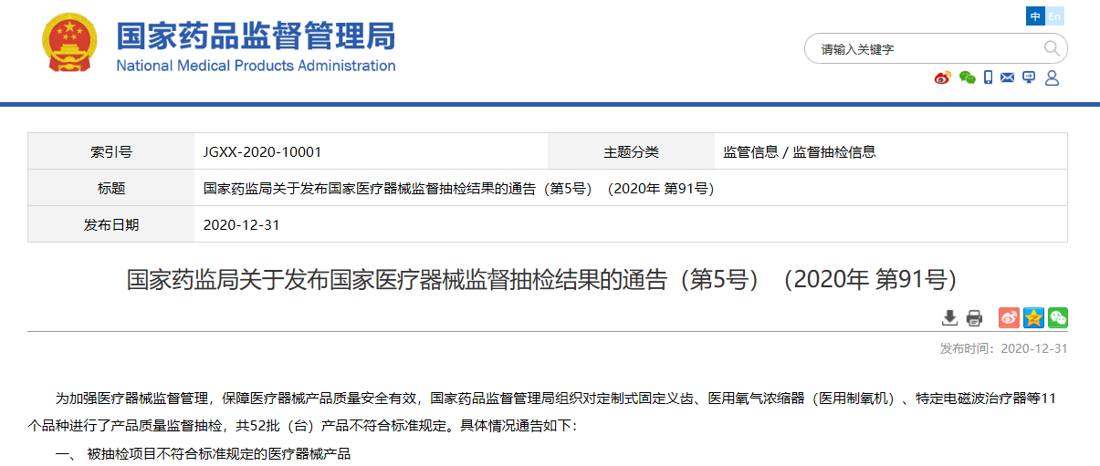 關(guān)于發(fā)布國家醫(yī)療器械監(jiān)督抽檢結(jié)果的通告(第5號)(2020年 第91號)