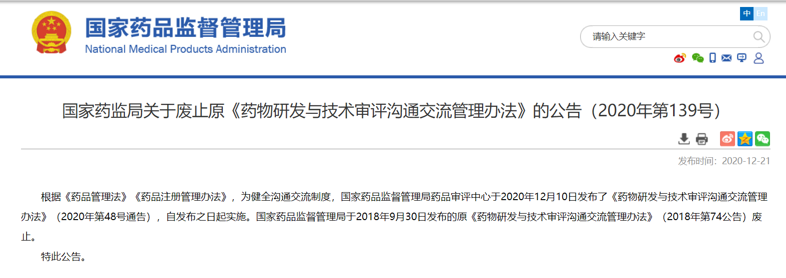關(guān)于廢止原《藥物研發(fā)與技術(shù)審評溝通交流管理辦法》的公告(2020年第139號)