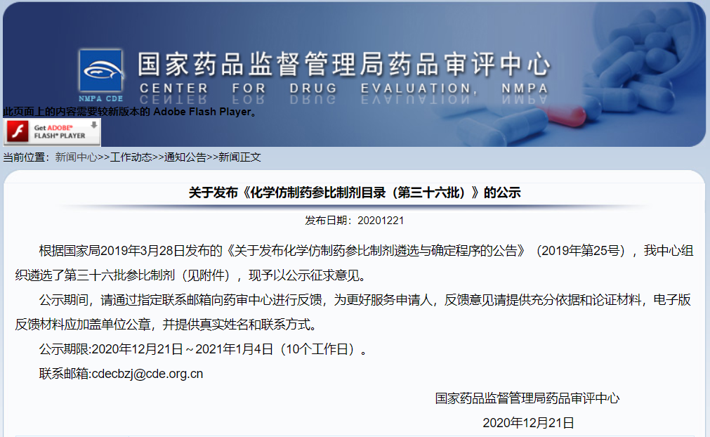 發(fā)布《化學(xué)仿制藥參比制劑目錄(第三十六批)》的公示