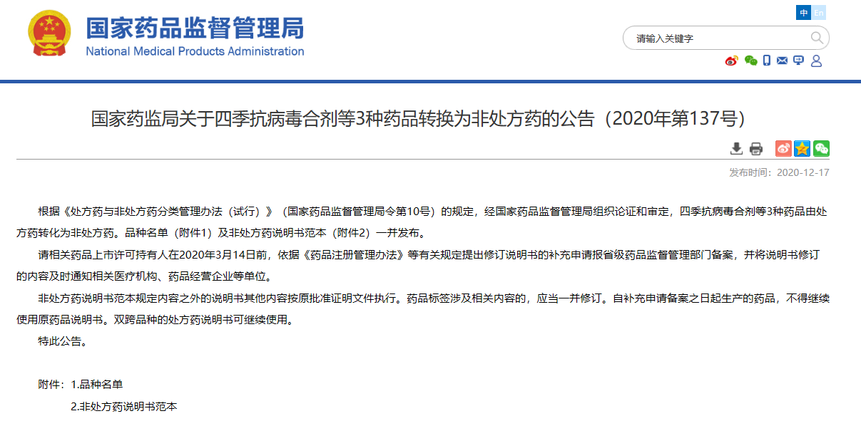 關(guān)于四季抗病毒合劑等3種藥品轉(zhuǎn)換為非處方藥的公告(2020年第137號)