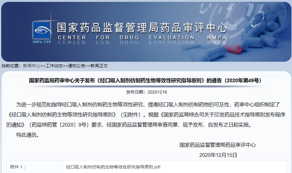 關(guān)于發(fā)布《經(jīng)口吸入制劑仿制藥生物等效性研究指導(dǎo)原則》的通告(2020年第49號)