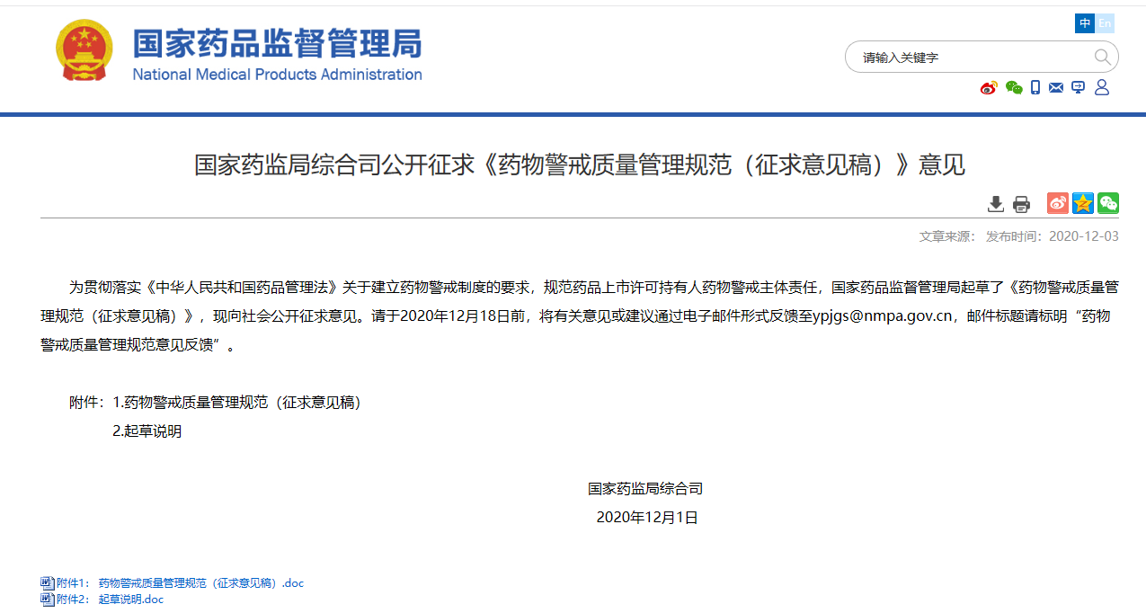 規(guī)范藥品上市許可持有人藥物警戒主體責(zé)任,國(guó)家藥品監(jiān)督管理局起草了《藥物警戒質(zhì)量管理規(guī)范(征求意見稿)》,.適用于藥品的非臨床研究、臨床試驗(yàn)、生產(chǎn)經(jīng)營(yíng)、上市后研究、不良反應(yīng)監(jiān)測(cè)及報(bào)告與處理等,現(xiàn)向社會(huì)公開征求意見,時(shí)間截止至2020.12.28。