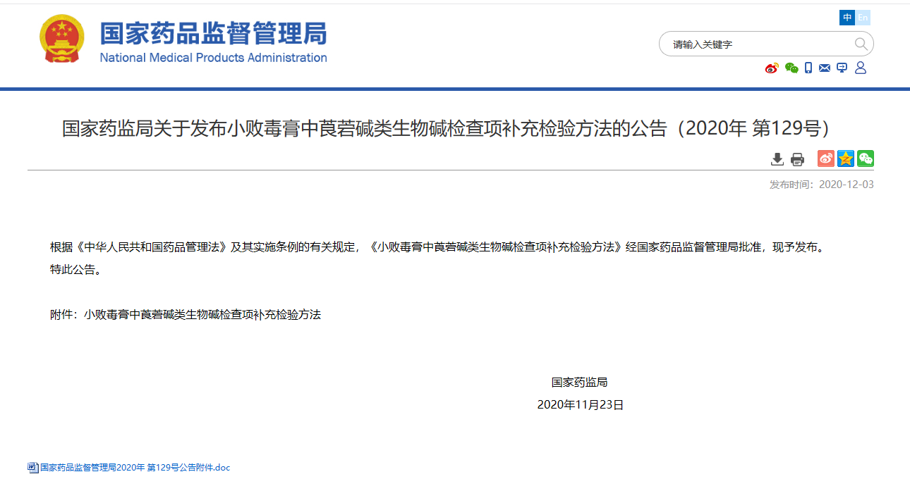 關(guān)于發(fā)布小敗毒膏中莨菪堿類生物堿檢查項(xiàng)補(bǔ)充檢驗(yàn)方法的公告(2020年 第129號(hào))