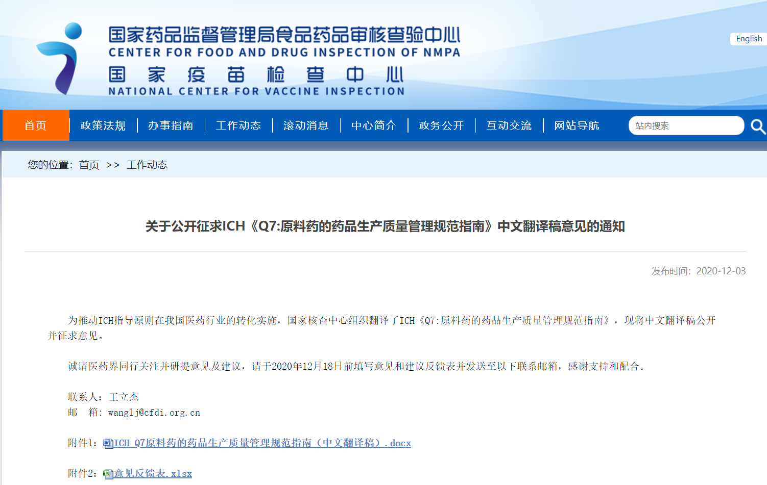 關(guān)于公開征求ICH《Q7:原料藥的藥品生產(chǎn)質(zhì)量管理規(guī)范指南》中文翻譯稿意見的通知