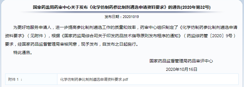 ? 國家藥監(jiān)局藥審中心關(guān)于發(fā)布《化學(xué)仿制藥參比制劑遴選申請資料要求》的通告(2020年第32號)