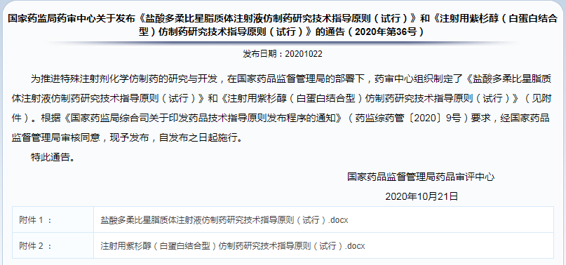 ? 國家藥監(jiān)局藥審中心關(guān)于發(fā)布《鹽酸多柔比星脂質(zhì)體注射液仿制藥研究技術(shù)指導(dǎo)原則(試行)》和《注射用紫杉醇(白蛋白結(jié)合型)仿制藥研究技術(shù)指導(dǎo)原則(試行)》的通告(2020年第36號)