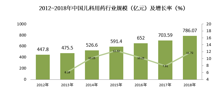 國(guó)內(nèi)市場(chǎng)兒童藥物規(guī)模與國(guó)際市場(chǎng)相匹配,2012年~2018年CAGR為+9.83%,2018年我國(guó)兒科用藥市場(chǎng)規(guī)模約為786.07億元,較上年同比增長(zhǎng)11.72%,國(guó)內(nèi)兒科用藥市場(chǎng)規(guī)模增長(zhǎng)迅速。