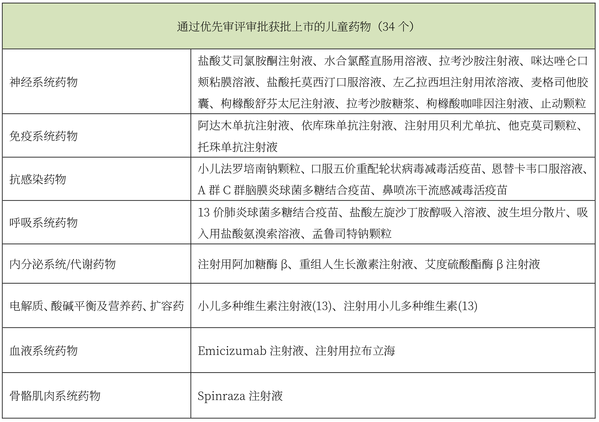 在兒童藥物優(yōu)先審評(píng)審批方面,2016-2019年國(guó)家局已陸續(xù)將989個(gè)品種納入優(yōu)先審評(píng)程序中,其中兒童藥物96件(占比為9.7%),已有80多個(gè)企業(yè)享受優(yōu)惠政策。截至目前,通過(guò)兒童用藥優(yōu)先審評(píng)審批上市的產(chǎn)品共計(jì)34個(gè),詳見(jiàn)下表。