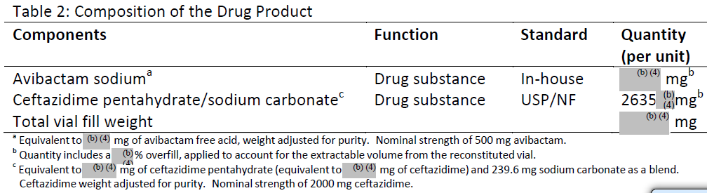 FDA審評(píng)報(bào)告明確本品存在過(guò)量灌裝(overfill),account for the extractable volume from the reconstituted vial(目的是使復(fù)溶后可抽取體積滿足要求),根據(jù)FDA提供數(shù)據(jù),計(jì)算頭孢他啶和阿維巴坦過(guò)量灌裝量約為2%。