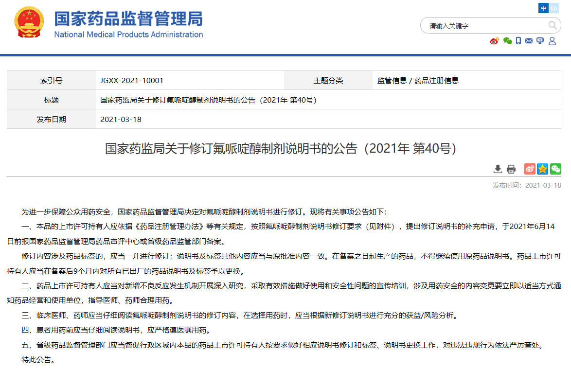 關(guān)于修訂氟哌啶醇制劑說明書的公告(2021年 第40號)
