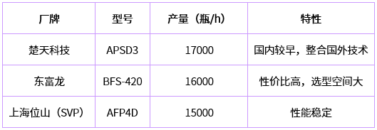 國內(nèi)生產(chǎn)BFS線的制造商主要有楚天科技、上海東富龍、上海位山等。主要型號及生產(chǎn)能力如下表所示(以2~5ml灌裝量為例):