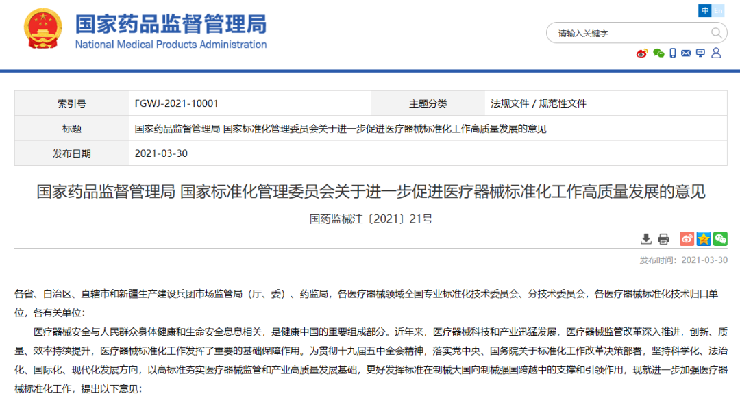 國家藥品監(jiān)督管理局 國家標(biāo)準(zhǔn)化管理委員會(huì)關(guān)于進(jìn)一步促進(jìn)醫(yī)療器械標(biāo)準(zhǔn)化工作高質(zhì)量發(fā)展的意見(2021-03-30)