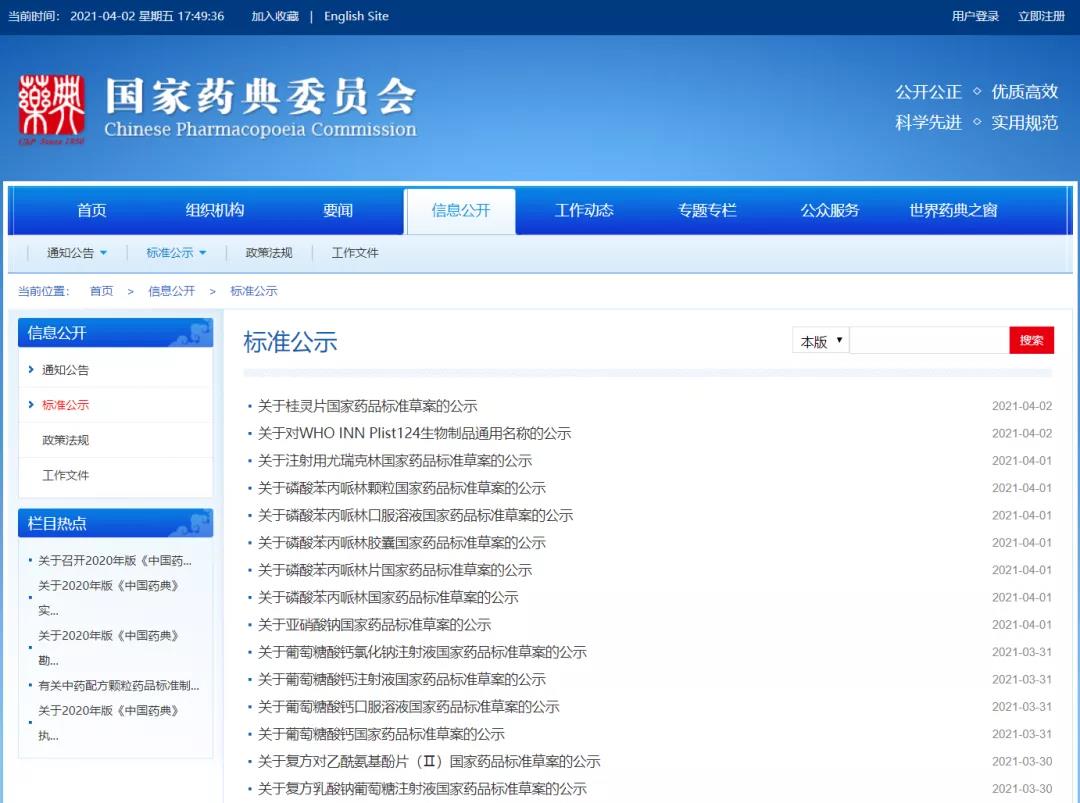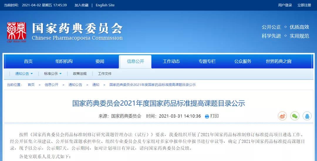 國家藥典委員會(huì)2021年度國家藥品標(biāo)準(zhǔn)提高課題目錄公示(2021-03-31)