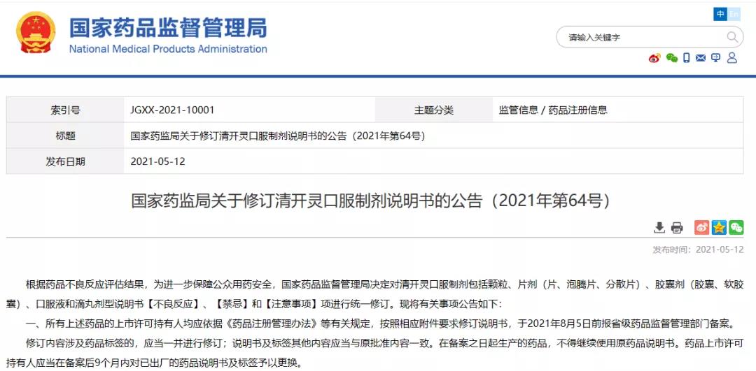 國家藥監(jiān)局關(guān)于修訂清開靈口服制劑說明書的公告(2021年第64號(hào))