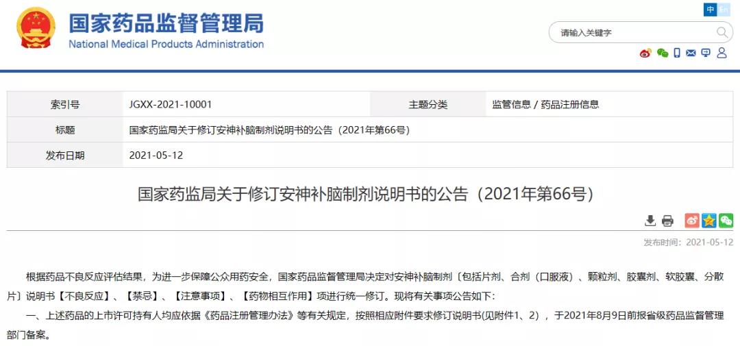 國家藥監(jiān)局關(guān)于修訂安神補(bǔ)腦制劑說明書的公告(2021年第66號(hào))