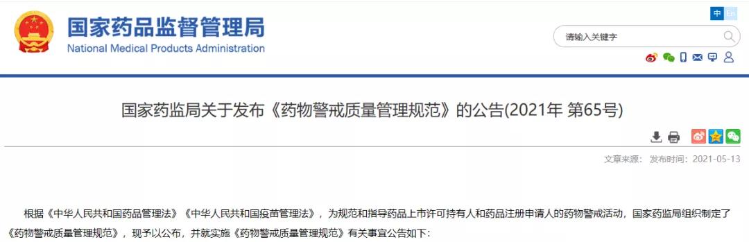 國家藥監(jiān)局關(guān)于發(fā)布《藥物警戒質(zhì)量管理規(guī)范》的公告(2021年 第65號(hào))