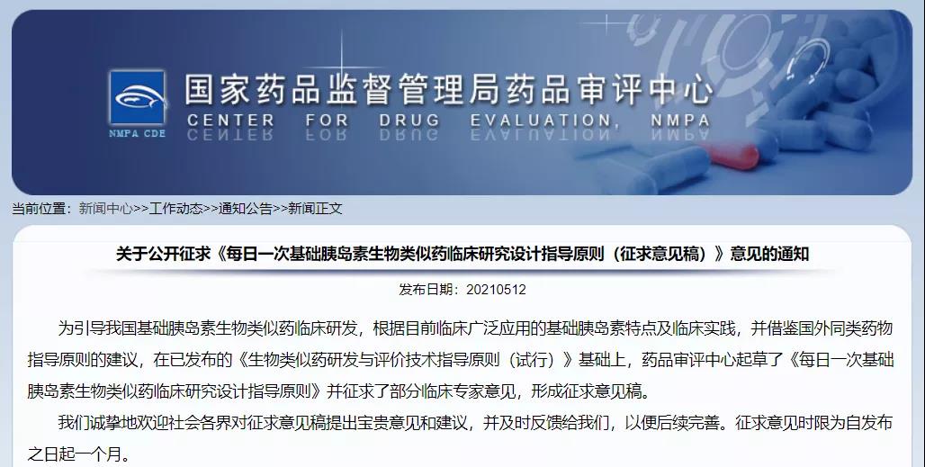 關(guān)于公開征求《每日一次基礎(chǔ)胰島素生物類似藥臨床研究設(shè)計(jì)指導(dǎo)原則(征求意見稿)》意見的通知