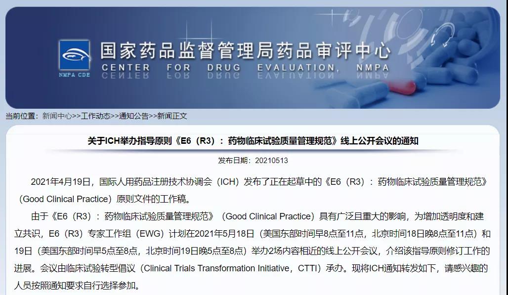 關(guān)于ICH舉辦指導(dǎo)原則《E6(R3):藥物臨床試驗(yàn)質(zhì)量管理規(guī)范》線上公開會(huì)議的通知