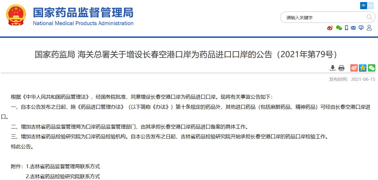 國家藥監(jiān)局 海關(guān)總署關(guān)于增設(shè)長春空港口岸為藥品進(jìn)口口岸的公告(2021年第79號)