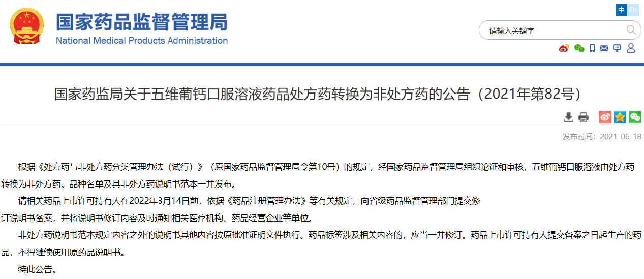 國家藥監(jiān)局關(guān)于五維葡鈣口服溶液藥品處方藥轉(zhuǎn)換為非處方藥的公告(2021年第82號)