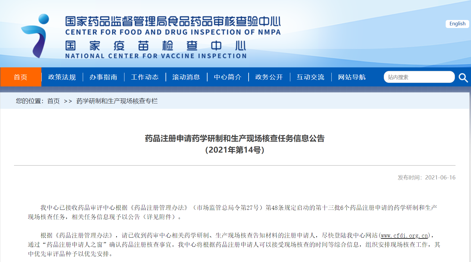 藥品注冊申請藥學(xué)研制和生產(chǎn)現(xiàn)場核查任務(wù)信息公告(2021年第14號)