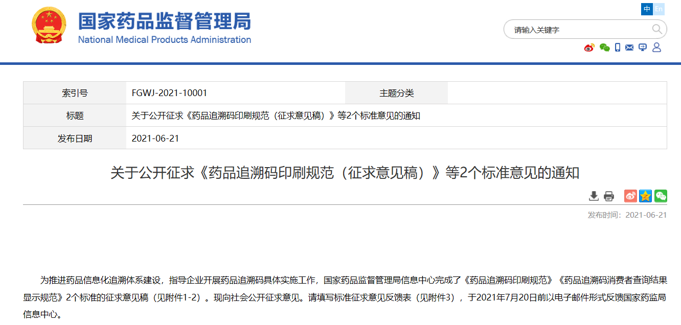 關(guān)于公開征求《藥品追溯碼印刷規(guī)范(征求意見稿)》等2個標(biāo)準(zhǔn)意見的通知