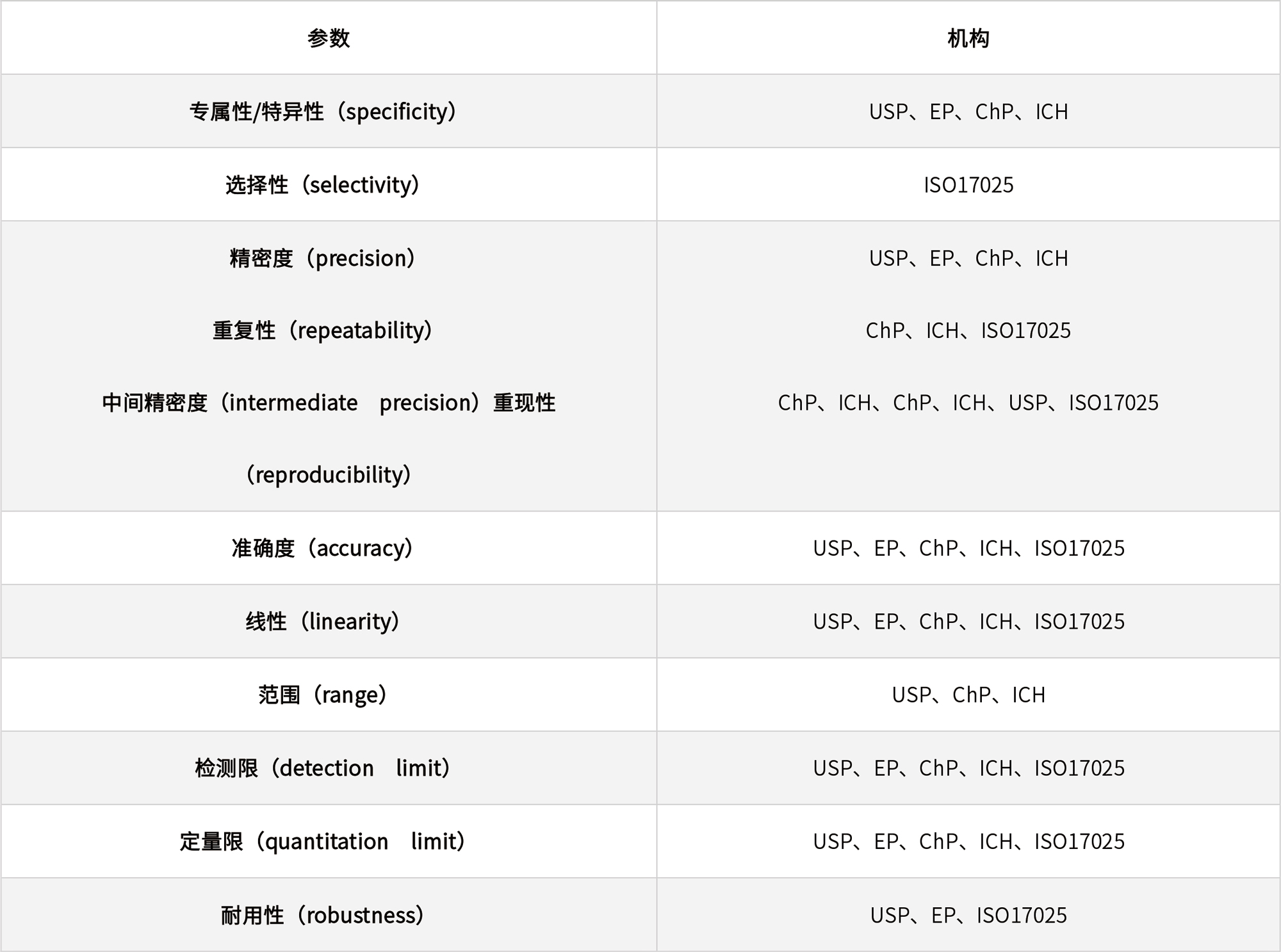 表1 不同國際組織和藥典要求的方法學(xué)驗(yàn)證參數(shù)