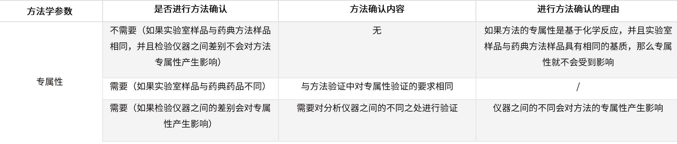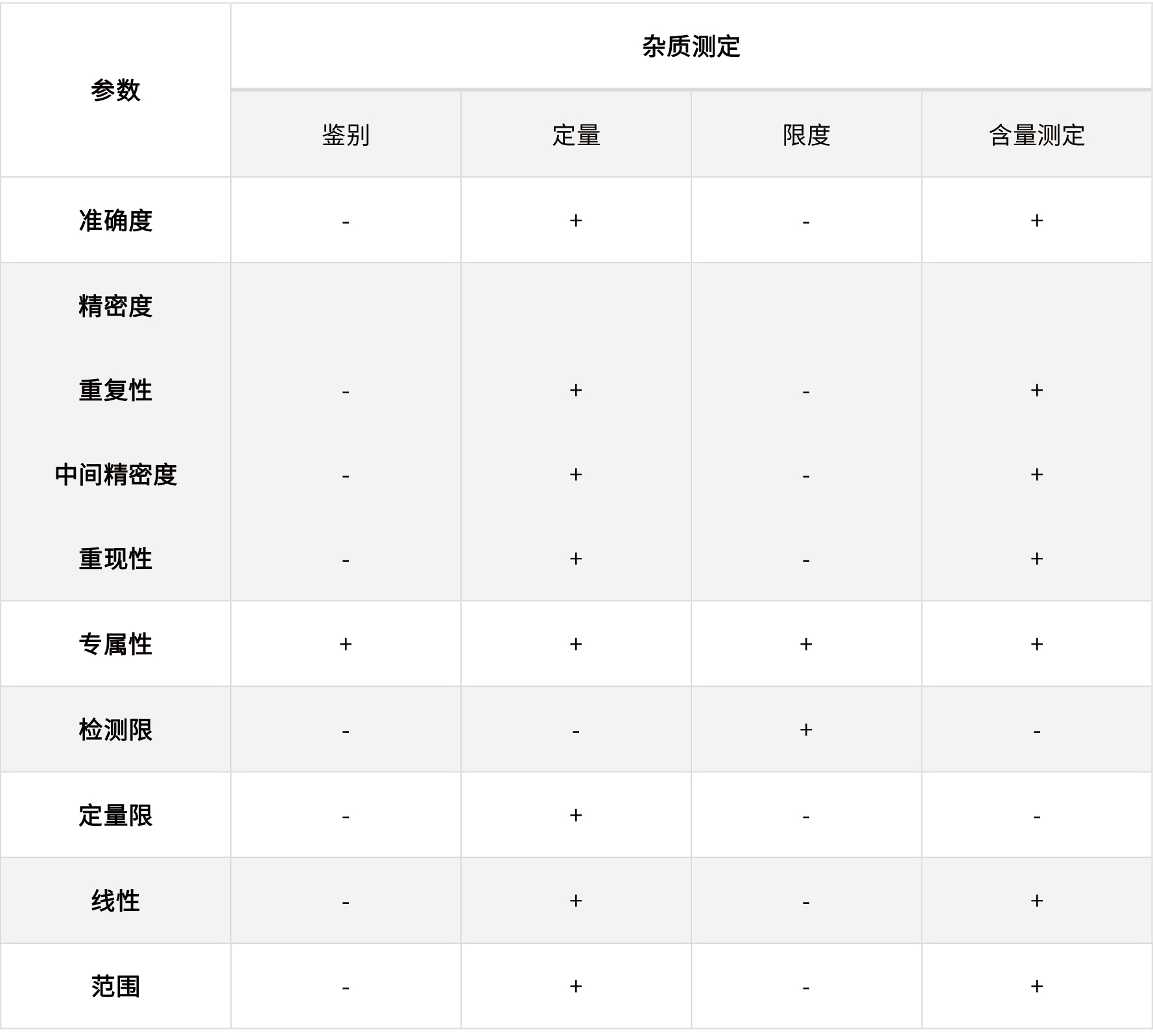 表2 ICH指導(dǎo)原則中規(guī)定的不同檢驗(yàn)?zāi)康男枰?yàn)證的參數(shù)