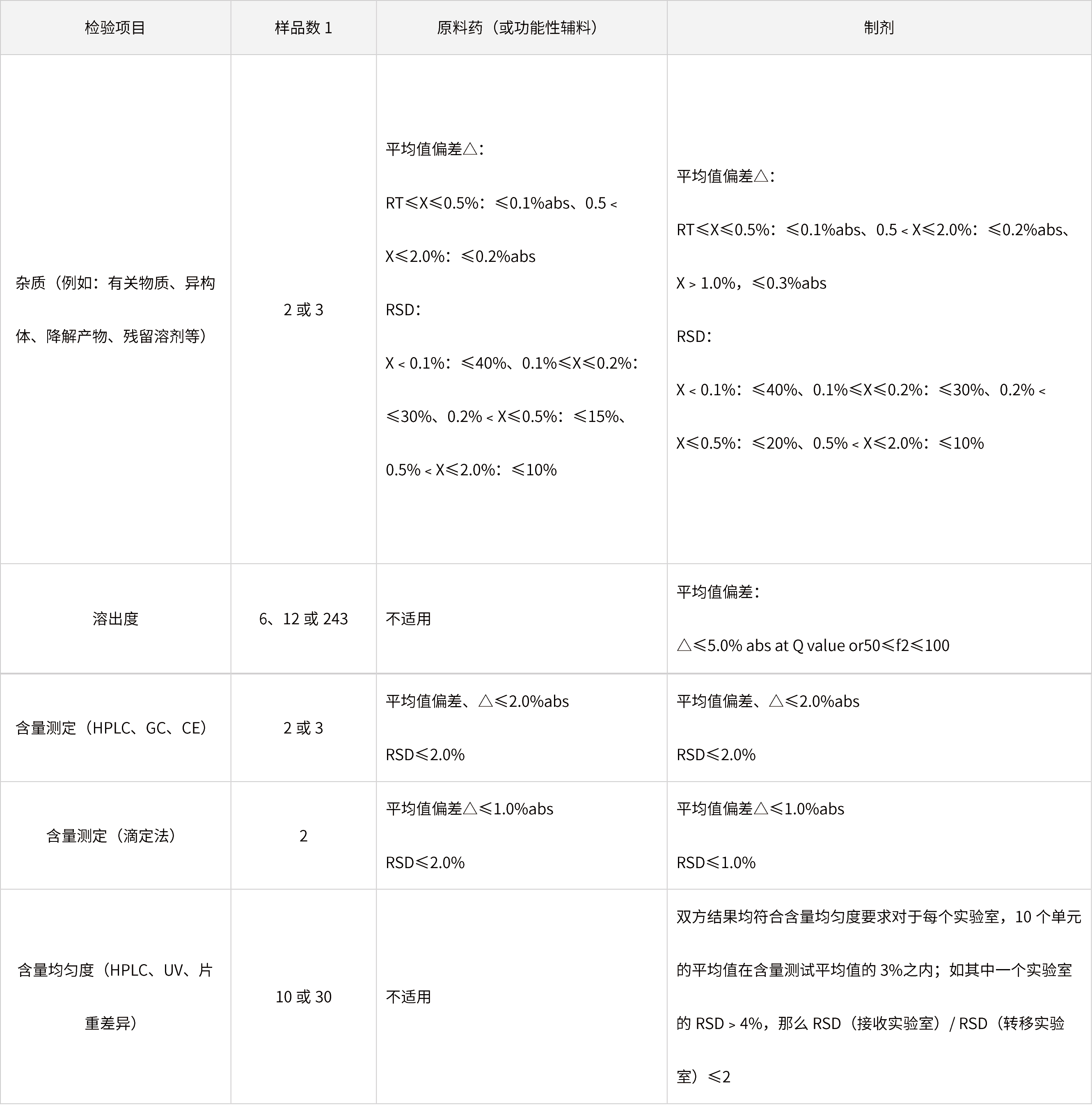 表3 通過比對(duì)試驗(yàn)進(jìn)行某樣品(原料或制劑)相關(guān)分析方法轉(zhuǎn)移的接收標(biāo)準(zhǔn)事例
