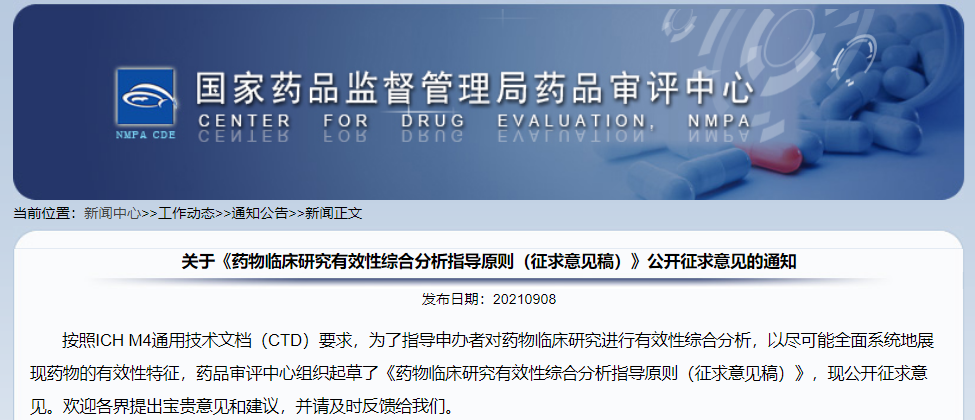 關(guān)于《藥物臨床研究有效性綜合分析指導原則(征求意見稿)》公開征求意見的通知