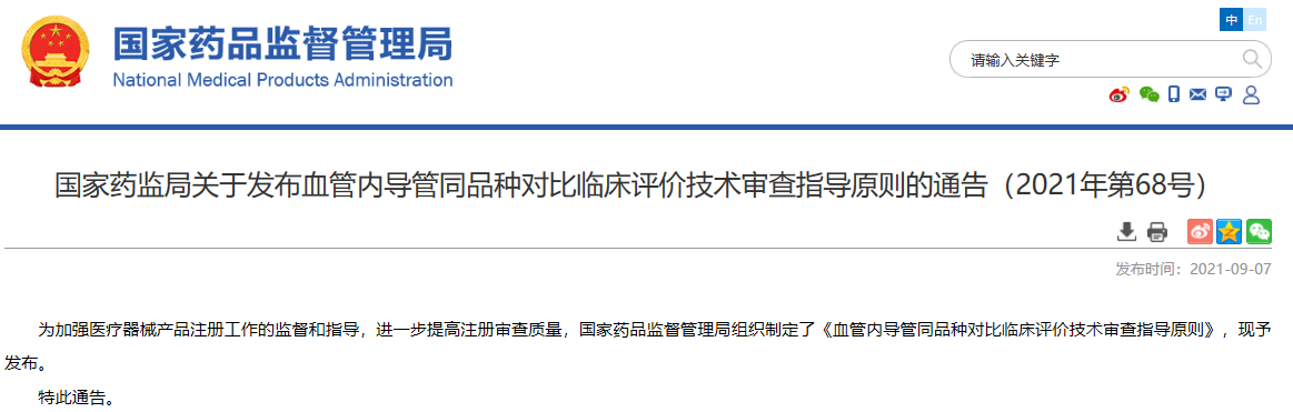 關(guān)于發(fā)布血管內(nèi)導管同品種對比臨床評價技術(shù)審查指導原則的通告(2021年第68號)