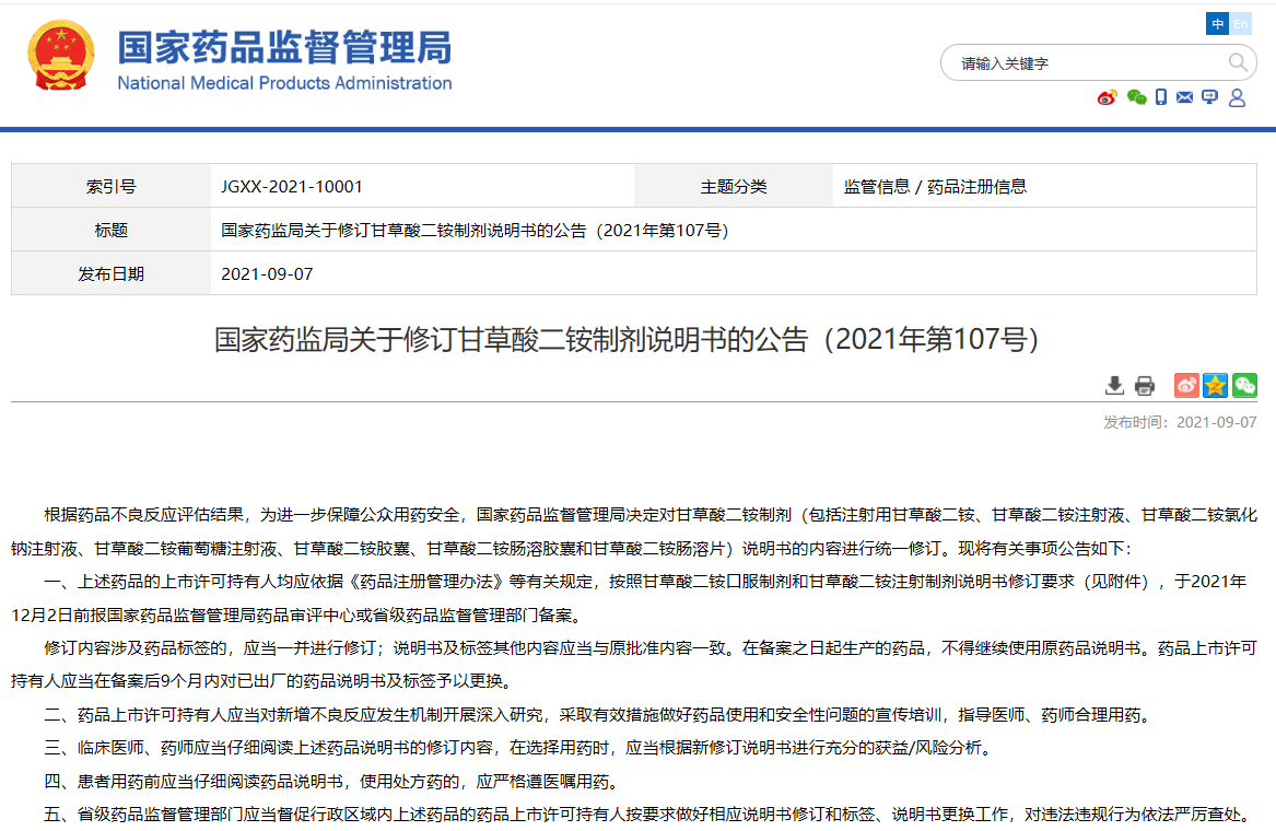 國家藥監(jiān)局關(guān)于修訂甘草酸二銨制劑說明書的公告(2021年第107號)