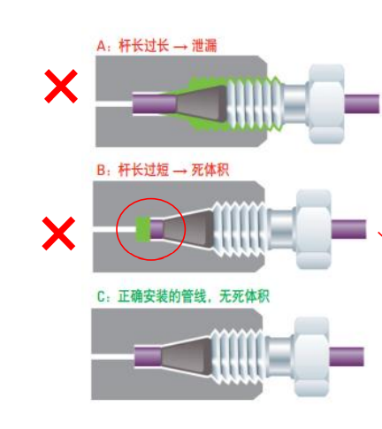 ? 安裝色譜柱時(shí)管線伸出接頭長(zhǎng)度過(guò)長(zhǎng),使得螺紋擰入較淺,會(huì)導(dǎo)致密封性不好而漏液,進(jìn)一步引起基線漂移或響應(yīng)降低;
