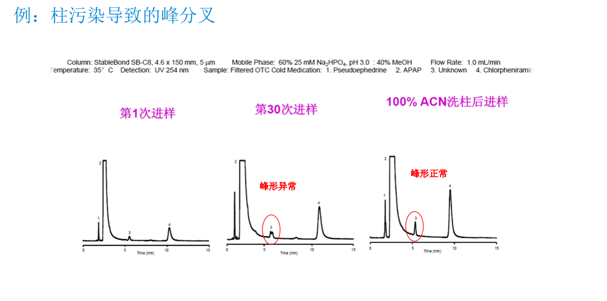 色譜柱在使用過(guò)程中因?yàn)闃悠坊蛘吡鲃?dòng)相帶來(lái)物理顆?;蛘呋瘜W(xué)吸附,引起色譜柱的污染,這時(shí)會(huì)在色譜圖上有明顯的變化。出現(xiàn)色譜柱污染時(shí),清洗或反沖清洗則需要根據(jù)色譜柱的特性進(jìn)行操作。清洗或反沖清洗反相色譜柱時(shí),用以下溶劑至少各30倍柱體積沖洗。