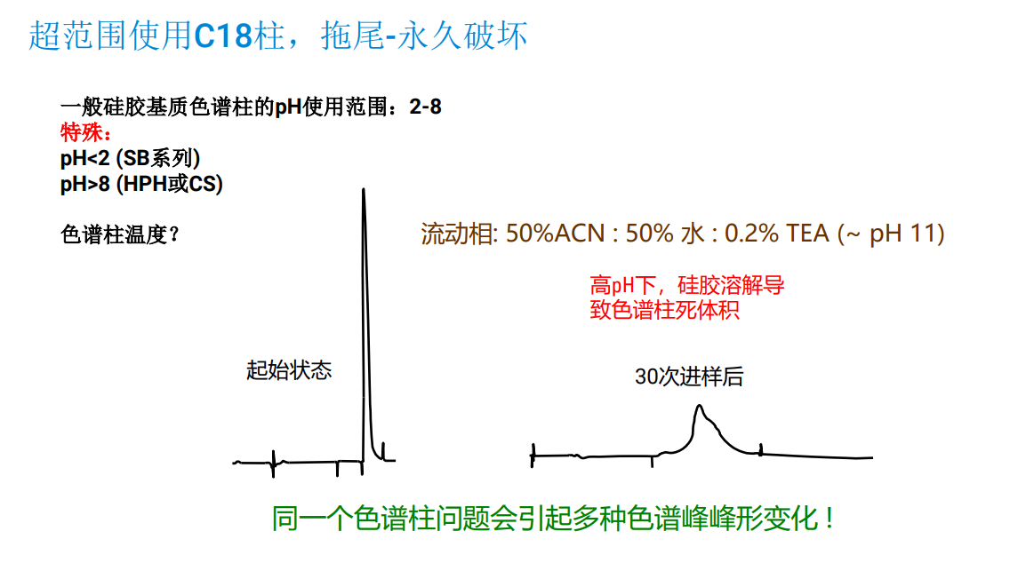 液相色譜柱使用過(guò)程中最常見(jiàn)的問(wèn)題包括pH值、溫度、溶劑耐受、壓力、樣品等。色譜柱使用條件不得超出廠家建議的范圍,包括最高壓力,pH范圍,水相耐受,柱溫等。當(dāng)測(cè)試條件接近色譜柱使用范圍的極限值時(shí),柱壽命會(huì)受影響。