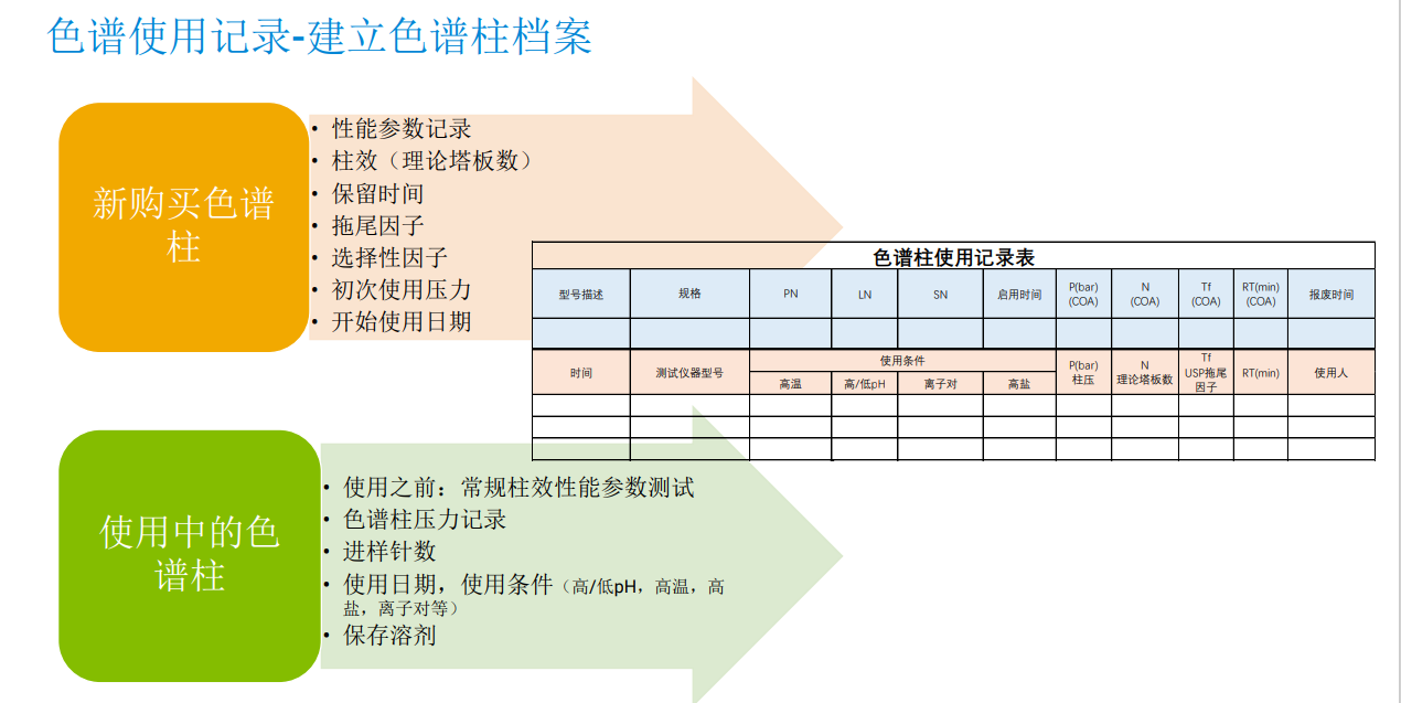 色譜柱是有生命周期的色譜分析關(guān)鍵耗材。為了保障色譜柱的正確使用,提高每一根色譜柱的產(chǎn)出,實(shí)驗(yàn)室需要給每根色譜柱建立檔案,對(duì)其從購(gòu)入到每次使用情況進(jìn)行真實(shí)的記錄,保障規(guī)范使用,同時(shí)為質(zhì)量管理體系建設(shè)提供原始的資料。