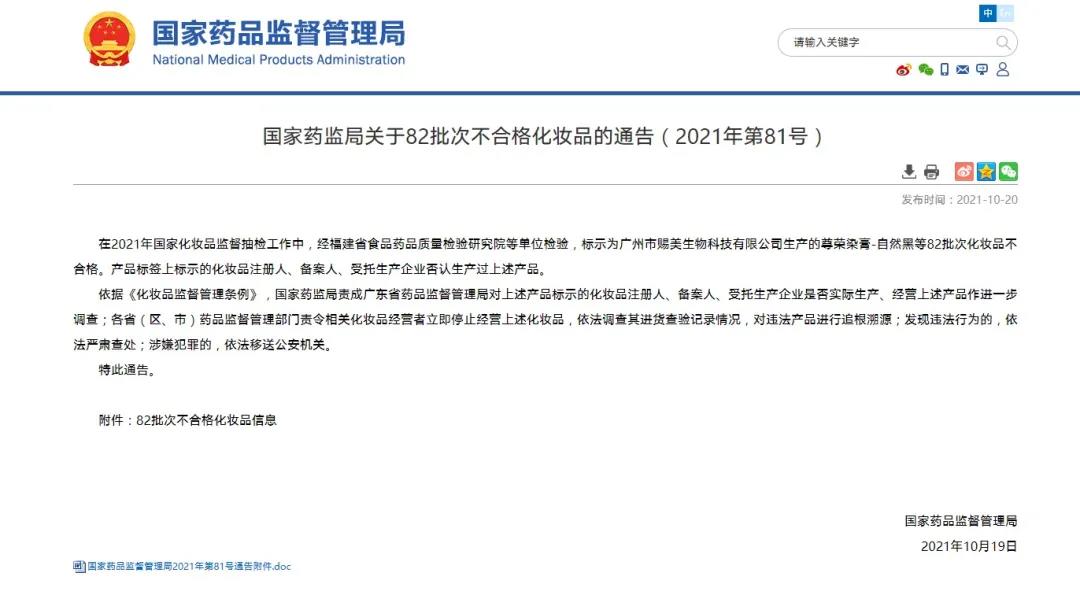 國家藥監(jiān)局關于82批次不合格化妝品的通告(2021年第81號)