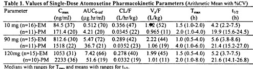 托莫西汀在體內(nèi)主要由CYP2D6酶代謝,兩種不同代謝的受試者PM(慢代謝者)和EM(快代謝者)對于藥物的吸收也不同,結(jié)果如下: