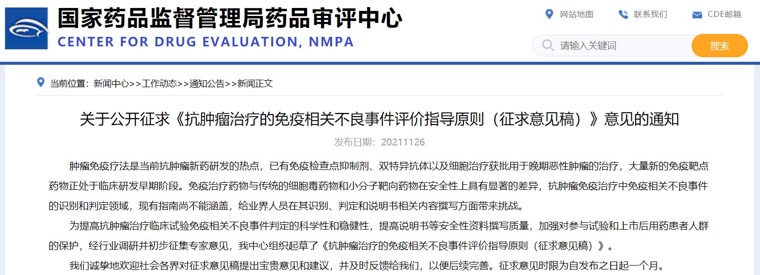 關(guān)于公開征求《抗腫瘤治療的免疫相關(guān)不良事件評(píng)價(jià)指導(dǎo)原則(征求意見稿)》意見的通知